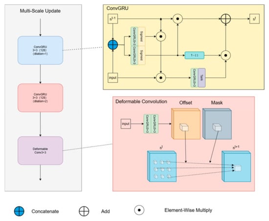 To tackle the challenge of optical flow estimation for dynamic objects exhibiting significant displacements, we introduce a novel multiscale update module that combines ConvGRU and deformable convolution (DCN). This framework facilitates the propagation of motion features across different spatial scales, ensuring coherence in displacement prediction. The initial segment of the module comprises a conventional ConvGRU alongside an augmented ConvGRU with a dilation rate of 2. In contrast to ConvLSTM, the ConvGRU framework employs a singular gated recurrent unit for computation, maintaining a streamlined design while enlarging the receptive field to handle substantial displacement complexities. The latter segment leverages deformable convolution to acquire knowledge of adaptive pixel offsets, as depicted in Figure 4.