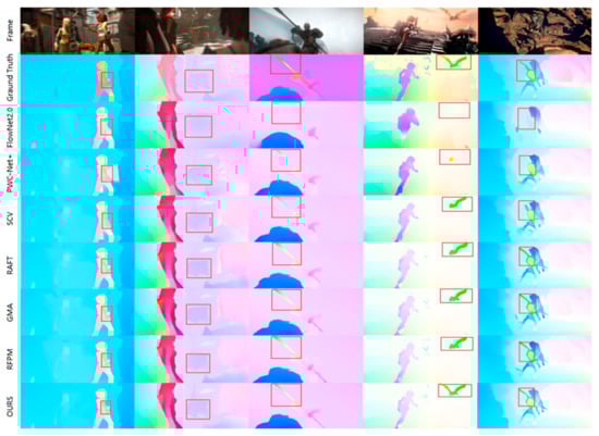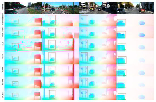 On the KITTI benchmark, as presented in Table 1, the proposed method also achieves state-of-the-art performance in terms of both accuracy and robustness for optical flow estimation in real-world driving scenes. Visualization results comparing the proposed method with mainstream models on KITTI are provided in Figure 7. Analysis of key regions highlighted in the figure demonstrates the method’s significant effectiveness in estimating the optical flow for large-displacement objects, such as vehicles, and small targets, including telephone poles, streetlights, and billboards. Furthermore, it achieves optimal performance in occluded regions. A discernible discrepancy persists between the estimated optical flow accuracy at the edges of real-world objects on the road (e.g., curbs, lane markings) and the requirements for practical applica.