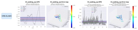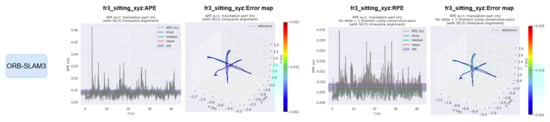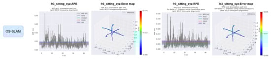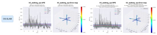 The EVO evaluation tool was used to compare the error between the proposed method and ORB-SLAM3. Figure 8 and Figure 9 compare the absolute pose error (APE) and relative pose error (RPE) of ORB-SLAM3 and the proposed system OS-SLAM under fr3_sitting_xyz. Figure 10 and Figure 11 compare the APE and RPE of ORB-SLAM3 and the proposed system OS-SLAM under fr3_walking_xyz.