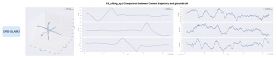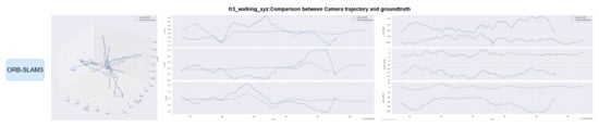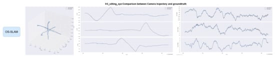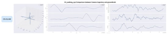 Trajectories of OS-SLAM and ORB-SLAM3 are compared on both sequences. Figure 12 and Figure 13 compare the trajectory curves of the two methods in the fr3_sitting_xyz sequence, and Figure 14 and Figure 15 compare the trajectory curves of the two methods in the fr3_walking_xyz sequence, and provide axis alignment comparisons of translation (xyz) and rotation (pitch, yaw, roll) parameters in 3D space.