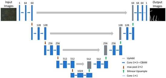 Building upon original U-Net architecture [], this study introduces an improved network designed to enhance feature expression capabilities. The core modifications are (1) the integration of a Convolutional Block Attention Module (CBAM) for adaptive weighting of feature channels and spatial locations [], and (2) the embedding of a novel feature extraction and fusion module (UpAdd) within the skip connections between the encoder and decoder []. The encoder consists of four stages with output channels of 64, 128, 256, and 512, respectively, followed by a 1024-channel bottleneck. The decoder mirrors the encoder, with skip-connections fused via UpAdd modules.