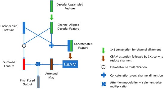 The decoder progressively restores spatial resolution through upsampling and incorporates corresponding feature information from the encoder via skip connections. While the original U-Net utilizes direct concatenation for feature fusion, this approach can introduce feature redundancy and semantic misalignment. To address this limitation, we designed the UpAdd module (detailed in Figure 2), which operates as follows: (1) applying bilinear interpolation upsampling to the output from the previous decoder layer; (2) using a 1 × 1 convolution to adjust the channel dimension of the upsampled features () to match that of the corresponding encoder skip connection feature (), ensuring channel alignment; (3) fusing and via element-wise addition ; (4) concatenating and and feeding the result into the CBAM module to generate a joint channel–spatial attention weight map ); (5) modulating the element-wise summation result from step 3 using ) via element-wise multiplication (see Equation (1)); and (6) processing the weighted features through a DoubleConv block to further refine high-quality fused features.