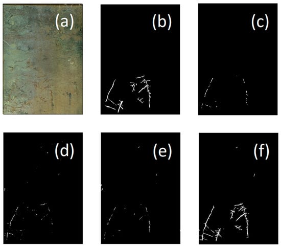 Comparison of segmentation performance with different methods. (a) Original image; (b) Annotated image; (c) PSPNet; (d) SegNet; (e) DeepLabV3+; (f) Improved U-net.