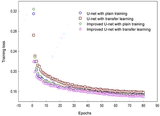 Figure 4 shows distinct loss evolution patterns between plain training and transfer learning throughout the training process. The improved U-Net model employing transfer learning achieved the lowest overall loss and fastest convergence, validating its superior parameter initialization via pre-trained weights and enhanced fitting efficacy.
