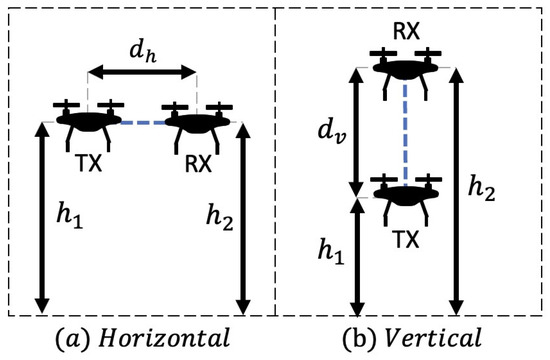 In this subsection, we explore the modeling tools under horizontal communication scenarios, considering various realistic drone altitudes, where the transmitter and receiver drones are at the same altitude (), and the distance between the transmitter and the receiver is depicted with , as shown in Figure 1a. Moreover, we also consider the simple analytical model [11], concerning distance (), frequency (f), and altitude (h).