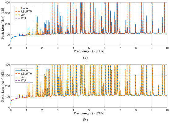 Path Loss with respect to frequency for drones at sea-level ( m), and m apart. (a) ‘USA model, high latitude, summer’ for HotW, tropical weather profile for LBLRTM, , and ITU. (b) ‘USA model, tropics’ for HotW, the U.S. Standard 1976 weather profile for LBLRTM, , and ITU.