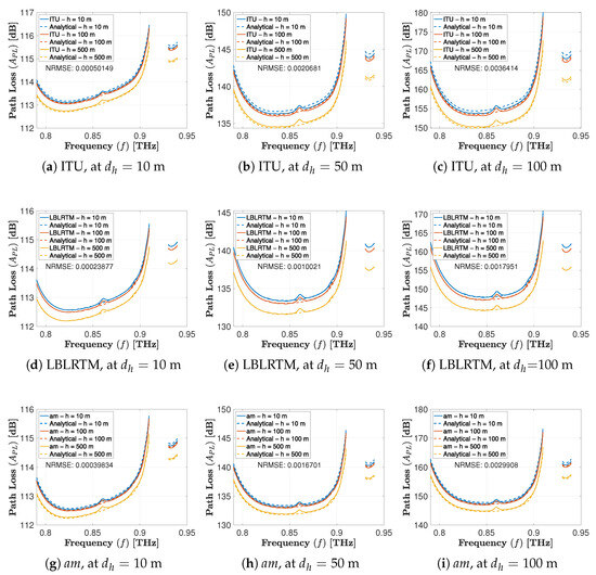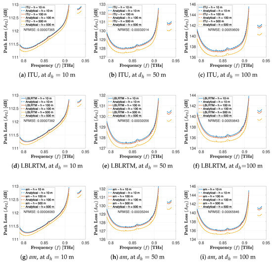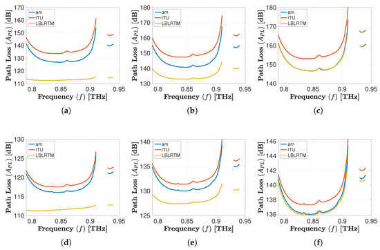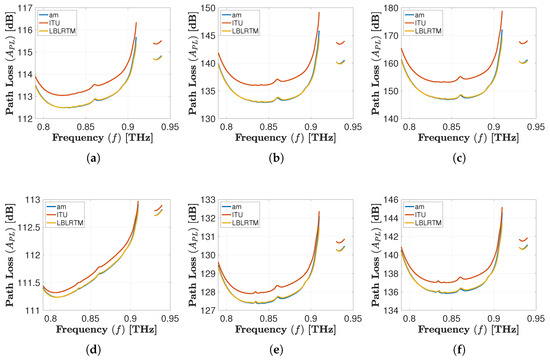Figure 3 depicts total path loss with respect to the frequency at m altitude under a tropical weather profile and the U.S. Standard 1976 profile. In Figure 3a–c, path loss values for the tools under the tropical weather profile, for three different distances m are given. In the next row, in Figure 3d–f, path loss values for the tools under the U.S. Standard 1976 profile at three different distances are given. As expected, the path loss for the tropical weather profile is higher, due to the increased water vapor concentration. As seen in the figure, the difference between am and LBLRTM is negligible, while ITU has a slight difference.