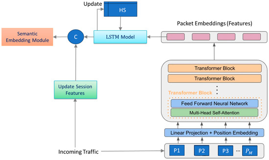 Let be the input sequence including consecutive packets. This sequence is processed by the transformer model, denoted by , to extract discriminative features that capture the relationships among these packets. To keep the window size small while maintaining high performance for classifying long sessions, the LSTM network maintains a hidden state that is reinitialized at the start of every session. summarizes all sequences processed so far and therefore encodes higher-level temporal dependencies across the session.