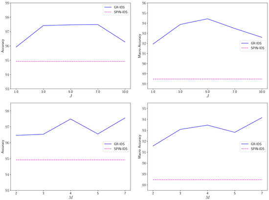 In the second experiment, the accuracy and macro accuracy of GR-IDS are measured as varies in the range . The results are illustrated in Figure 5.
