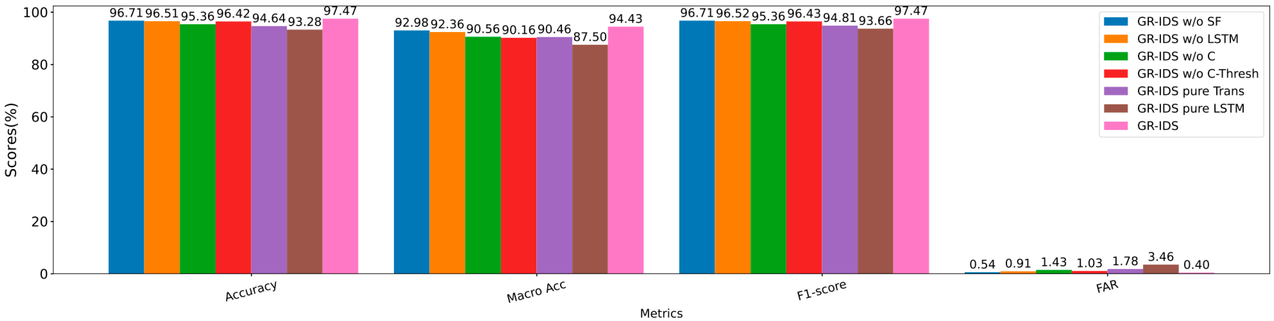 - GR-IDS w/o LSTM: Derived by omitting the LSTM network from the feature encoder.
