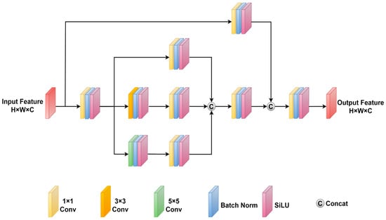 Remote sensing images typically exhibit a large number of small objects that are densely distributed. Traditional convolutional neural networks (CNNs), limited by their fixed receptive fields, struggle to capture rich object feature information. To address this issue and enhance the network’s perception of small objects, this paper proposes a multi-scale feature extraction module (MSFEM). By employing convolutional operations of different scales within a multi-branch structure, the multi-scale feature extraction module can extract object feature information from multiple receptive field sizes. This enables the network to better understand the relationships between pixels in the feature map, thereby improving detection accuracy. Figure 2 illustrates the detailed structure of the multi-scale feature extraction module. The multi-scale feature extraction module consists of four feature extraction branches. The main branch includes convolutional modules of 1 × 1, 3 × 3, and 5 × 5, while the residual branch contains only a 1 × 1 convolutional module. It is worth noting that each convolutional module comprises three components: a convolutional layer, batch normalization, and a SiLU activation function.