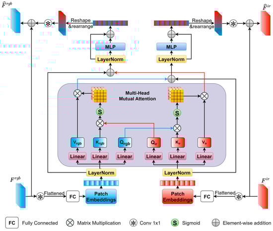 Initially, two 1 × 1 convolutional layers are employed to reduce the channel number of resulting in , where (H, W) represents the spatial resolution of the feature maps, is the original channel number, and is the reduced channel number. Subsequently, the multi-head cross-attention and the two feed-forward networks require sequences as inputs. Therefore, and are reshaped into two flattened 2D patch sequences , where is the dimension of each flattened patch, with a resolution of (P, P), and is the number of patches. Thereafter, through two fully connected layers, and are encoded into patch embeddings , where d is the dimension of each patch embedding. Finally, are further processed through two normalization layers.