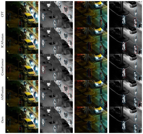 (a). Detection results on the LLVIP dataset: Figure 5 shows the detection outcomes for LLVIP, with rows from top to bottom representing CFT, ICAFusion, CrossFormer, AMFusion, and the cross-modal remote sensing object detection network. It is evident that the first three methods exhibit various degrees of missed detections due to insufficient extraction of complementary features. In contrast, the cross-modal remote sensing object detection network significantly improves the detection results. This confirms the effectiveness of the method proposed in this paper for cross-modal object detection images.