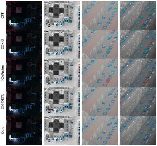 (b). Detection results on the Drone Vehicle dataset: Figure 6 displays the performance of the proposed cross-modal remote sensing object detection model alongside other methods, arranged from top to bottom as CFT, COMO, ICAFusion, GM-DETR, and the cross-modal remote sensing object detection network. Due to the impact of lighting and extreme weather conditions, several methods fail to fully exploit the advantages between infrared and visible light, leading to varying degrees of missed and false detections. In contrast, this paper’s method enhances the interaction between visible light and infrared features, effectively integrating complementary information, significantly reducing missed and false detections, and thus outperforming the comparative methods. This also demonstrates the effectiveness of the approach proposed in this paper.