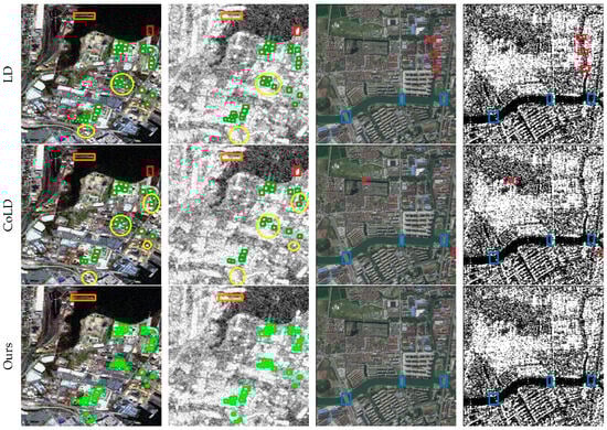 (c). Detection results on the OGSOD dataset: Figure 7 illustrates the visual detection performance of several methods on the OGSOD dataset. From top to bottom, these are LD, CoLD, and the cross-modal remote sensing object detection method. Due to the noise and scattering effects in SAR images, there is inconsistency and redundancy between modalities, leading to varying degrees of missed and false detections in the results of other methods. The feature interaction module and the feature correction fusion module proposed in this paper aim to reduce modal inconsistency and redundancy, enabling the network to achieve better classification and more true positives (TPs).