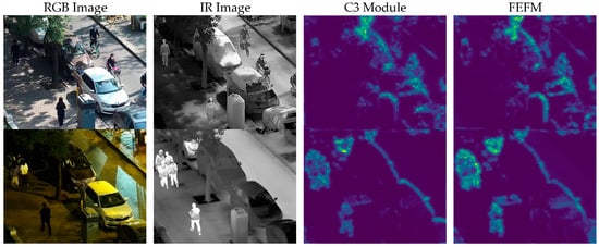 A comparison of feature map visualizations between the C3 (CSP Bottleneck with 3 convolutions) module and the multi-scale feature extraction module, with RGB and IR scenes divided into day and night. The third column displays the visualization results of the C3 module, while the fourth column shows the visualization results of the multi-scale feature extraction module.