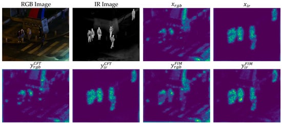 The visualization results of the feature interaction module. Where and represent the visualization results of visible light and infrared images, respectively; and denote the complementary feature visualization results of infrared and visible light by the CFT module; and indicate the complementary feature visualization results of infrared and visible light by the feature interaction module.