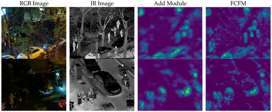 (f). Visualization results of the feature correction fusion module: To verify the effectiveness of the feature correction fusion module (FCFM), this paper visualizes the feature maps in Figure 10 and compares its performance with the element-wise addition method. Figure 10 shows a comparison of feature maps between the element-wise addition and the FCFM. The first row displays the visible light and infrared images under well-lit night conditions, while the second row shows the same under low-light (extremely dark) conditions. The third column presents the feature maps from element-wise addition, and the fourth column shows the feature maps from the FCFM. Under well-lit night conditions, the feature maps from element-wise addition can extract basic edges and texture features but struggle with spatial inconsistencies and feature redundancies between visible light and infrared modalities. This leads to less clarity in distinguishing object edges from background noise, resulting in insufficient feature extraction accuracy. In contrast, the FCFM significantly improves the quality of feature maps through spatial and channel-level feature correction mechanisms. Spatial feature correction aligns visible light and infrared features, effectively eliminating local spatial differences and enhancing the clarity of object features. Channel-level feature correction optimizes the semantic information of feature maps through global optimization, further highlighting object features. These mechanisms work synergistically to enhance feature extraction accuracy and robustness under well-lit night conditions. Under low-light (extremely dark) conditions, the element-wise addition method is particularly prone to noise and background interference in complex night scenes, further reducing detection accuracy. The feature maps from element-wise addition lack clarity and are often overwhelmed by background noise. The FCFM, however, demonstrates significant improvements in feature map quality under extremely low-visibility conditions. Spatial feature correction effectively aligns visible light and infrared features, reducing local spatial differences and enhancing object feature clarity. Channel-level feature correction optimizes the semantic information of feature maps through global optimization, further highlighting object features. Through these mechanisms, the FCFM effectively suppresses background noise and modal redundancy, significantly improving detection accuracy in complex night scenes.