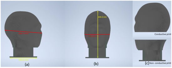 3D model of the conductive head phantom showing (a) side view and (b) front profile. (c) Component separation showing conductive upper section and non-conductive base.