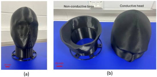 The 3D model was adapted from an open-source human skull frame (Skull_frame.stl) developed by Yu and Hairston [88], which provides anatomically realistic proportions for EEG applications. The original model was systematically modified to create the separable components required for our hybrid conductive/non-conductive design. The separation plane was positioned to maximize the conductive surface area available for electrode testing while maintaining structural integrity during fabrication and use. Figure 1 illustrates the final phantom design, showing both the overall geometry and the component separation strategy.