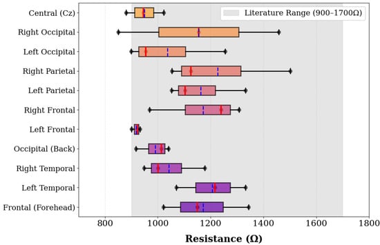 Distribution of resistance measurements across anatomical locations. Box plots represent the three measurements per location, showing median, mean, and individual measurements. The shaded region indicates the expected resistance range (900–1700 ) for injection-molded phantoms.
