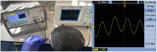 Signal transmission capabilities were systematically evaluated using precision instrumentation to verify suitability for EEG-relevant frequency ranges. The test configuration employed a calibrated function generator providing a 200 Hz sinusoidal test signal, with signal integrity monitored using a high-impedance digital oscilloscope connected through the phantom material between standardized electrode positions. The experimental setup and resulting signal characteristics are documented in Figure 5.