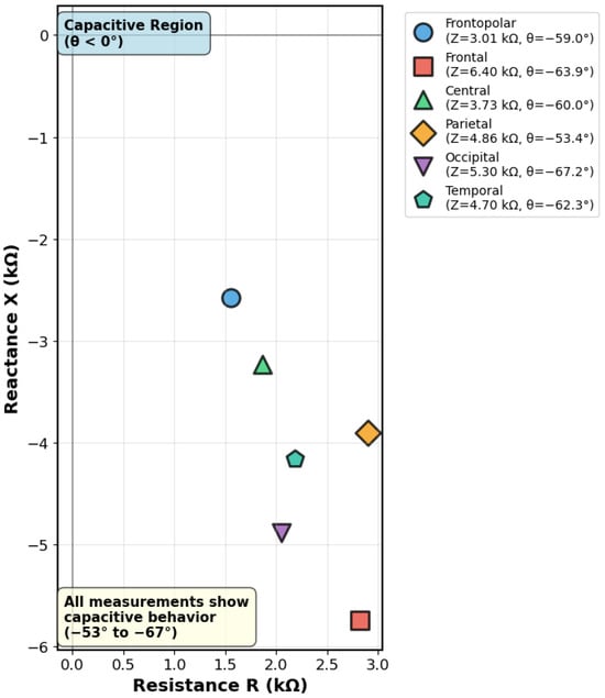 - Comprehensive electrical characterization using multi-tier validation: DC resistance measurements (821–1502 ), complex impedance spectroscopy at 100 Hz revealing spatial variation (3.01–6.4 k) and capacitive behavior (phase angles −53° to −67°), and clinical EEG system compatibility demonstration (5–11 k electrode-phantom interface impedance)