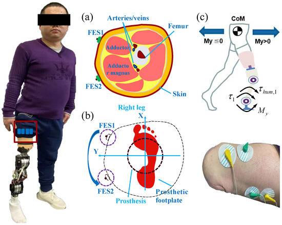 Sense the change of contact force of leg prosthesis. (a) Transversal surface of the stump of amputee. (b) Position of electrodes to induce the sense of torque . (c) Relationship between and the motion of body.