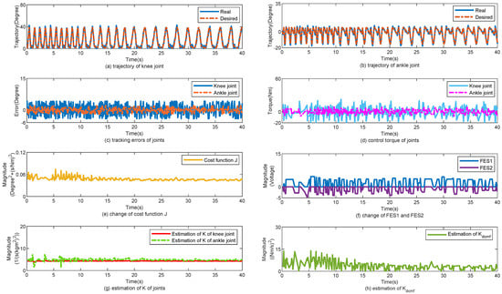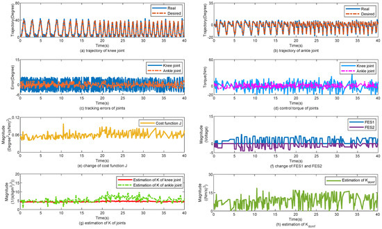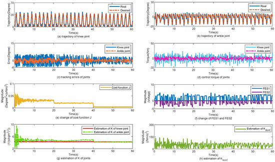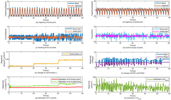 Walk from low speed to high speed. (a) Tracking performance on knee joint. (b) Tracking performance on ankle joint. (c) Tracking errors of joints. (d) Control torque of joints. (e) Change of cost function J. (f) Change of FES1 and FES2. (g) Estimation of K of joints. (h) Estimation of .