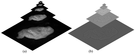 - Contrast: Contrast is typically measured using Michelson contrast [31] or RMS contrast [32]. However, in this application, a Laplacian filter was applied to the grayscale version of each image. The absolute value of the filter’s response was then calculated for each pixel. This method tends to assign higher weights to significant image features, such as edges and textures. This feature is denoted as C (the contrast weights) and is computed separately for each pixel in the image