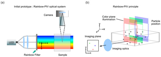 (a) Initial prototype: Rainbow-PIV optical system. (b) Rainbow-PIV principle. Reprinted with permission from reference [59].