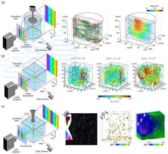 Numerous hurdles need to be overcome to guarantee sufficient precision during the practical implementation of the projector-based illumination strategy. Noto et al. [68] addressed the in situ calibration of the correlation from color to depth, which was a key technical challenge in the development of color PTV for accurate three-dimensional flow field reconstruction. Conventional methods relied on pre-calibrated depth-color maps, which were highly sensitive to changes in imaging geometry, lighting conditions, and optical aberrations. These challenges made them impractical for dynamic experimental setups. To overcome this, the authors proposed an in situ calibration technique that reconstructed the color-to-depth mapping directly during experiments, eliminating the need for a precisely controlled calibration environment. As shown in Figure 3a (left), the experimental setup included several major components: a rectangular vessel with a cylindrical annulus seeded with tracer particles; a propeller-driven impeller generating a rotating flow field as the validation target; a consumer-grade LCD projector producing a rainbow-colored beam, collimated by a Fresnel lens illuminating a 60 mm-thick volume; and a single CMOS camera capturing side view particle images. The full-field volume measured was approximately 200 × 60 × 150 mm3. Depth encoding was achieved through the color gradient, and particle depth positions were inferred from their RGB values.