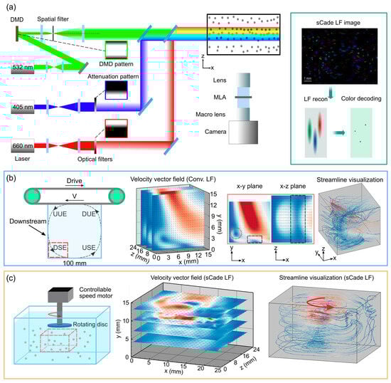- Wang, K.; Xing, F.; Lin, B.; Su, L.; Liu, J.; Yang, X.; Tan, H.; Wang, D. Synthetic Color-and-Depth Encoded (sCade) Illumination-Based High-Resolution Light Field Particle Imaging Velocimetry. Opt. Express 2024, 32, 27042. [Google Scholar] [CrossRef]