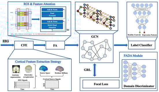 Framework of the proposed depression classification model. EEG signals are first mapped to cortical source space, extracting high-resolution brain cortical features (CFE), enhanced through a multi-head attention mechanism (FA). Then, a GCN integrates cortical connectivity to extract deep features for classification. Meanwhile, the FADA module with Focal Loss is introduced to enhance cross-subject generalization and discrimination of challenging samples.