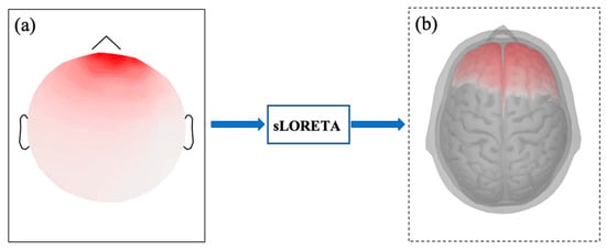 Cortical source signals are reconstructed via sLORETA using the Brainstorm toolbox (v3.4) in MATLAB R2021a []. The reconstruction process begins by building a four-layer boundary element head model, comprising the scalp, outer skull, inner skull, and cortex []. This model is based on the ICBM152 MNI standard template, defining a cortical source space with 15,002 vertices (~5 mm spacing). Each vertex is represented by a current dipole oriented perpendicular to the cortical surface.