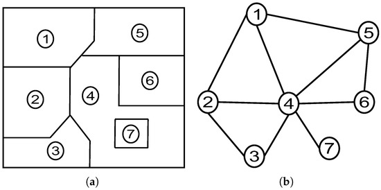 Let denote an indirect image-driven graph of an image , which is called the Region Adjacency Graph (RAG) [48]. By definition, the RAG represents the adjacency of regions with a graph, which can be represented by a set of vertices (nodes) and a set of edges . Mathematically, the graph can be formalized as: