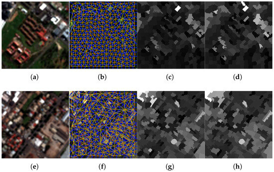 The proposed graph-based superpixel segmentation structure is shown graphically in Figure 4 using two samples of remote sensing datasets acquired from the GeoEye-1 [see Figure 4a–d] (GE1) and WorldView-3 (WV-3) [see Figure 4e–h] satellites. In this example, the corresponding boundaries, resulting from an initial segmentation method using SLIC are marked in blue color. The edges are marked as yellow lines and the centroids as red points. Comparing the obtained graph-based image with the segmentation results from directly applying SLIC [46], as in Figure 4d,h, we note that the presented process (RAG on SLIC over-segmentation) enables grouping of superpixels with similar sizes, as well as merging of small-sized superpixels. Recall that SLIC is considered an initial step for the proposed graph-based superpixel method. As depicted in Figure 5, the number of regions (i.e., graph-based superpixels) decreased from 220 to 160 for the Captown-GE1 dataset and from 200 to 105 for the Adelaide-WV3 dataset after the node merging step.