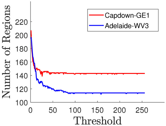 Figure 5 depicts an example for determining the threshold parameter using the GeoEye-1 (Captown-GE1) and WorldView-3 (Adelaide-WV3) datasets. It shows the variation in the number of regions (ie., superpixels initially generated by SLIC) versus the grayscale pixel values of the considered images. It is observed that the number of regions decreases after the node merging stage by applying the RAG concept. Using a number of initial clusters , the parameters for the resulting graph-based superpixels are equal to the following: , , and for the Captown-GE1 dataset; and , , and for the Adelaide-WV3 dataset. Moreover, we note that the second dataset gives a lower number of graph-based regions than the first dataset. This is explained by the fact that the urban dataset contains more textured and heterogeneous structures.