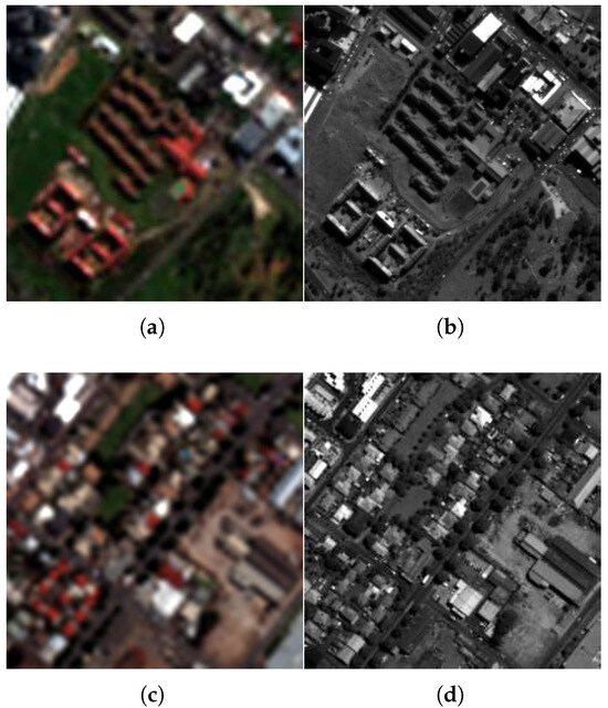 Figure 6. Datasets. (a,b) Captown dataset, (c,d) Adelaide dataset. The first column presents the expanded MS image, and the second column displays the PAN image. - 2.