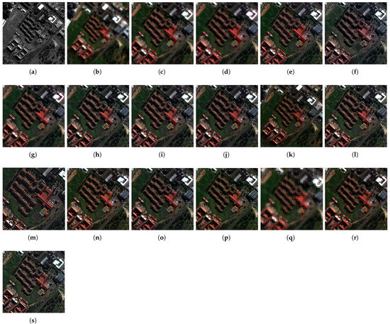 - Adelaide dataset: This dataset is exhibited in Figure 6c,d. It displays an urban area of Adelaide city (Australia). It is acquired by the WorldView-3 (WV-3) satellite, working in the visible and near-infrared (NIR) spectrum range. The data contain an eight-band MS image covering four standard (blue, green, red, and NIR1) and four new (coastal, yellow, red edge, and NIR2) bands and a PAN image, with a m and a m SSI, respectively. The size of the PAN image is pixels and that of the MS image is pixels. The resolution ratio is equal to four. The radiometric resolution is 16 bits. The characteristics of the Adelaide set include dense buildings, trees, soil, and some cars.