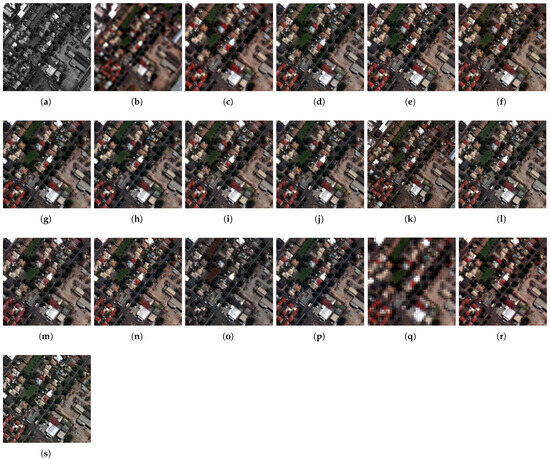 The proposed approach was evaluated by carrying out the reduced [44] and the full-resolution [55] assessment procedures. The Spectral Angle Mapper (SAM) [56], the Erreur Relative Globale Adimensionnelle de Synthèse (ERGAS) [44], the Spatial Correlation Coefficient (SCC) [54], the Structural Similarity Index Measure (SSIM) [57], the Peak Signal-to-Noise Ratio (PSNR) [58] and the Quaternion-based index () [55] are selected for the reduced scale assessment procedure and the Quality with no Reference (QNR) [55] for the full-scale quality assessment.