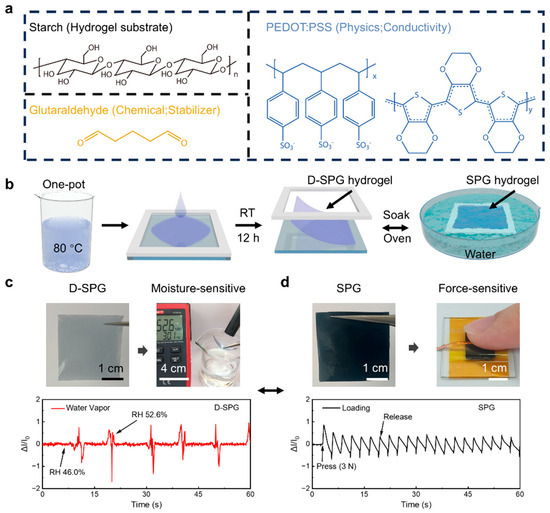 Dual-responsive starch-based hydrogel sensors. (a) Component materials and (b) schematics of fabrication processes of D-SPG and SPG hydrogels. (c,d) Photographs and stimulus signal curves of humidity-sensitive D-SPG and force-sensitive SPG.