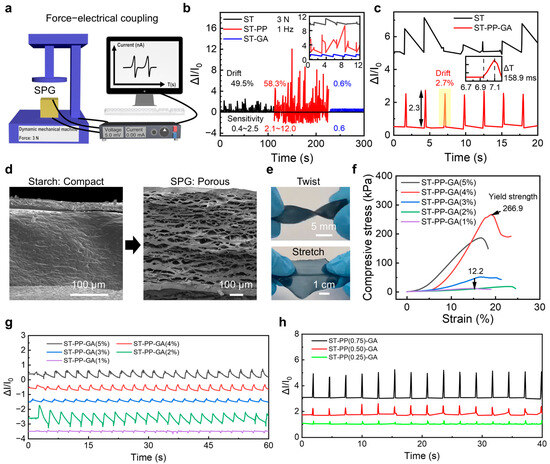 Force-sensing property of SPG sensors. (a) Schematic of the Force-electrical coupling device. (b,c) Signal sensitivity (ΔI/I0) of ST, ST-PP, ST-GA, and ST-PP-GA under the constant force of 3 N. All samples are the same size, 1 cm × 1 cm × 2 mm. (d) SEM images of starch and SPG hydrogel films. (e) Large deformations. (f) Compressive mechanical properties of hydrogel. (g,h) Signal sensitivity (ΔI/I0) of SPG sensors with various GA and PP contents under the constant force of 3 N. All samples are the same size, 1 cm × 1 cm × 2 mm.