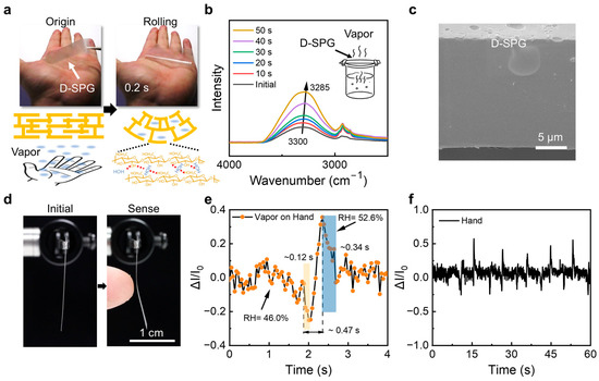 Humidity-sensing property of D-SPG sensors. (a) Photographs and schematic illustrations of the D-SPG film sensitivity to humidity. (b) Humidity-dependent ATR-FTIR spectra for D-SPG film as exposure to water vapor from 0 to 50 s. (c) SEM images of D-SPG films. (d) Photographs of D-SPG non-contact humidity-sensitive bending. (e,f) Signal sensitivity of D-SPG sensors under same humidity (54.6%). All samples are the same size, 2.0 cm × 0.5 cm × 15 μm.