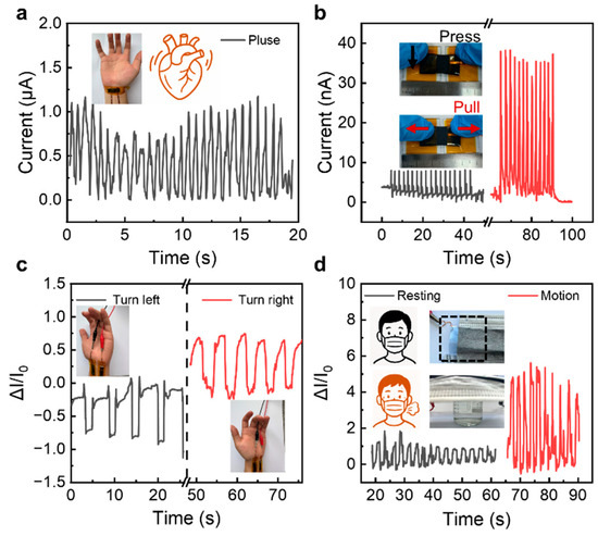 D-SPG and SPG hydrogel films served as piezoresistive sensors in a 5 mV circuit. Current signals were measured for data acquisition, but, due to inherent resistance differences among the samples, the baseline (no-load) current varied. To standardize sensitivity measurements, we established the no-load current as I0 and the real-time current as I. Signal sensitivity was determined using the relative change to ensure consistent and comparable results across all samples, as in Formula (1):
