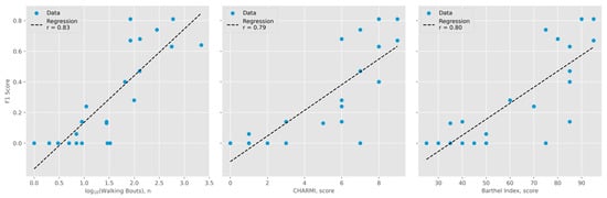 Gait detection performance compared to activity level. Shared Y-axis represents F1 scores. (Left): number of walking bouts detected by the Mobilise-D algorithm (logarithmic scale, base 10; r = 0.83). (Middle): Charité Mobility Index (CHARMI) scores (r = 0.79). (Right): Barthel Index scores (r = 0.80).