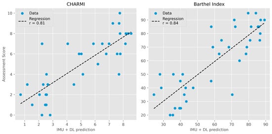 Deep learning prediction of assessment scores compared to actual scores. (Left): Charité Mobility Index (CHARMI; r = 0.81). (Right): Barthel Index (r = 0.84). IMU = inertial measurement unit. DL = deep learning (TabPFN).