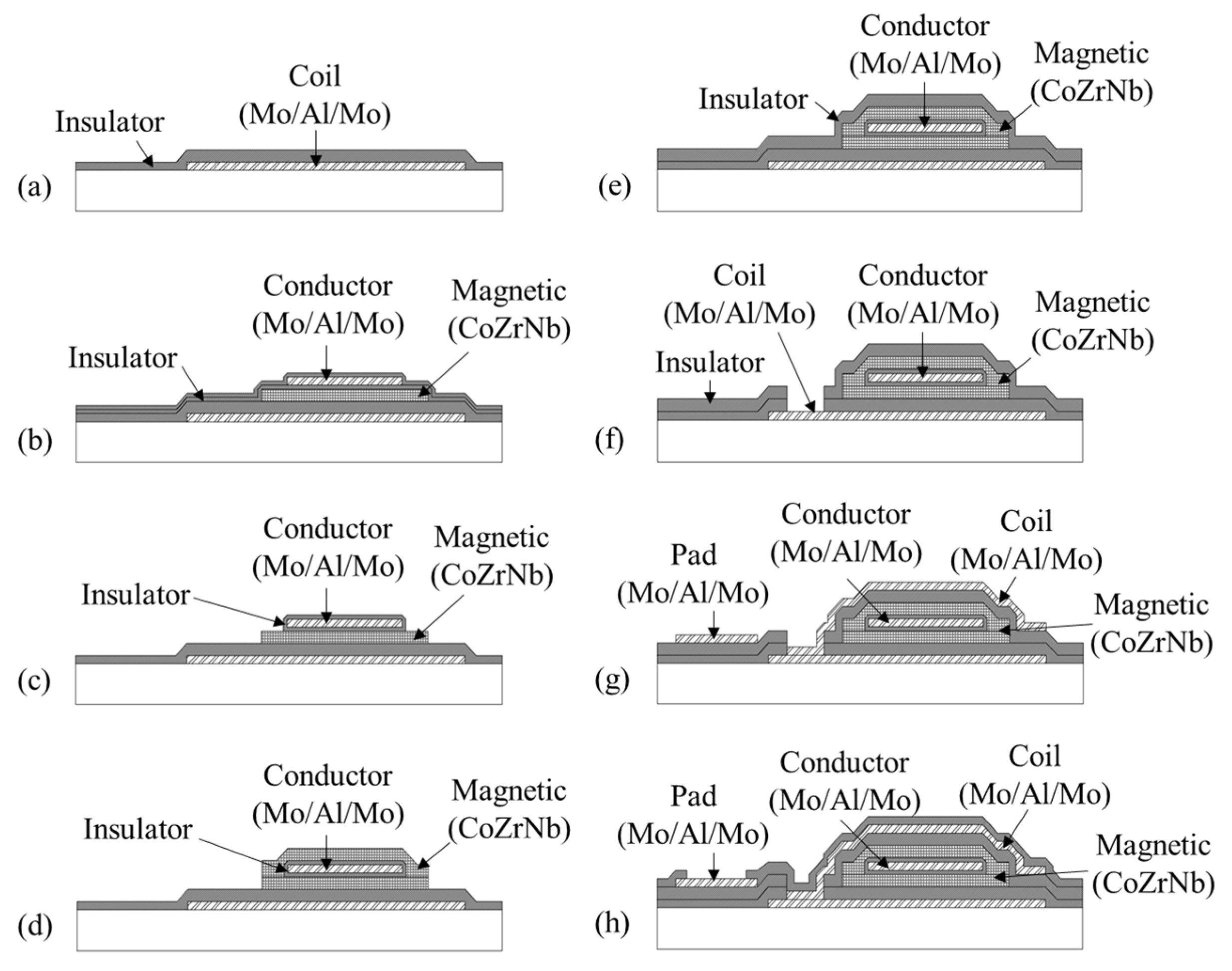 - Viala, B.; Valls, O.; Gaud, P.; Aid, M.; Royet, A.S.; Cuchet, R.; Damiani, D.; Ledieu, M.; Acher, O. High Frequency Magnetic Properties of CoZrNb thin films Deposited by Dynamic Sputtering Technique for GHz Si-integrated Planar Inductors. Trans. Magn. Soc. Jpn. 2002, 2, 384–387. [Google Scholar] [CrossRef][Green Version]