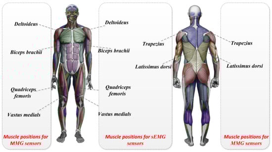 The patch electrodes and the sEMG signal sensors were then attached to the highest part of the muscle belly of the target muscle. The location of the surface EMG signals or MMG sensors on the muscles is shown in Figure 2. The two sensor-mounting locations on the back of the human body are shown in Figure 3.