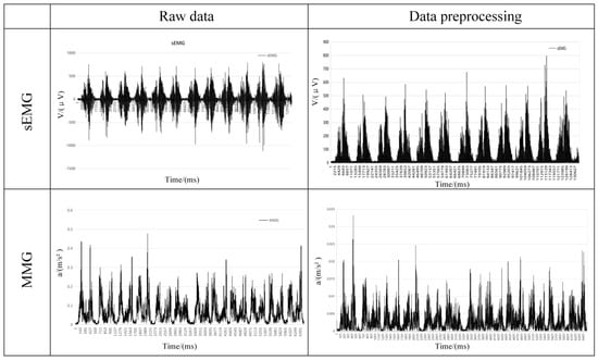 In this study, the sEMG signal was processed for noise reduction. A fourth-order Butterworth filter was used for filtering with a bandpass frequency of 20–500 Hz, and then the signal was corrected after filtering. Since the MMG signal is slightly different in the acquisition frequency, it is a low-frequency signal, and the effective frequency is usually 10–50 Hz, so there is a difference in the bandpass frequency between the two frequencies in pre-processing. In this study, the MMG signal was processed for noise reduction. A fourth-order Butterworth filter was used for filtering with a bandpass frequency of 10–50 Hz, and the signal was corrected after filtering. The before-and-after comparison of the two signals after pre-processing is shown in Figure 7.